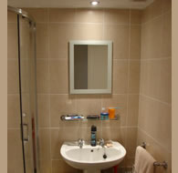 Palace builders fully renovated this bathroom in a West London home. The bathroom project included: Installation of a new bathroom suite, (sink, shower and lavatory), laying of a contemporary slate floor and the addition of ceiling spot lights.