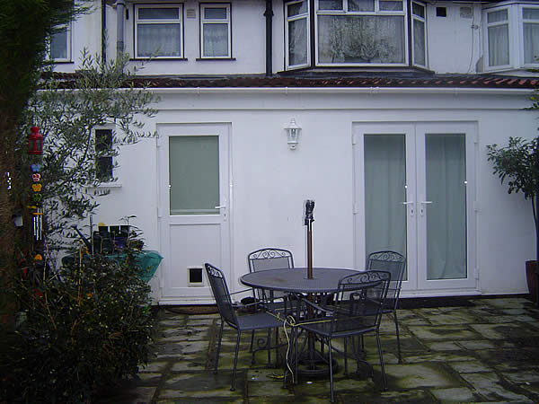 A large back extension was built onto this house in South London. The extension includes a toilet and living room with French doors and velux windows in the roof.